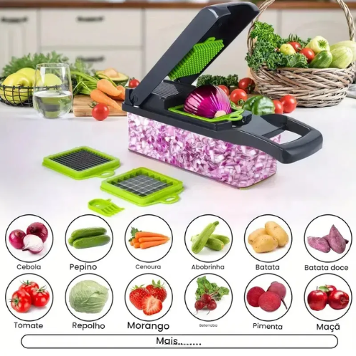 Compacto e fácil de armazenar, este cortador de legumes multifuncional é perfeito para preparar saladas, legumes, frutas, batatas, cebolas e diversos alimentos com rapidez e praticidade, economizando tempo no dia a dia.